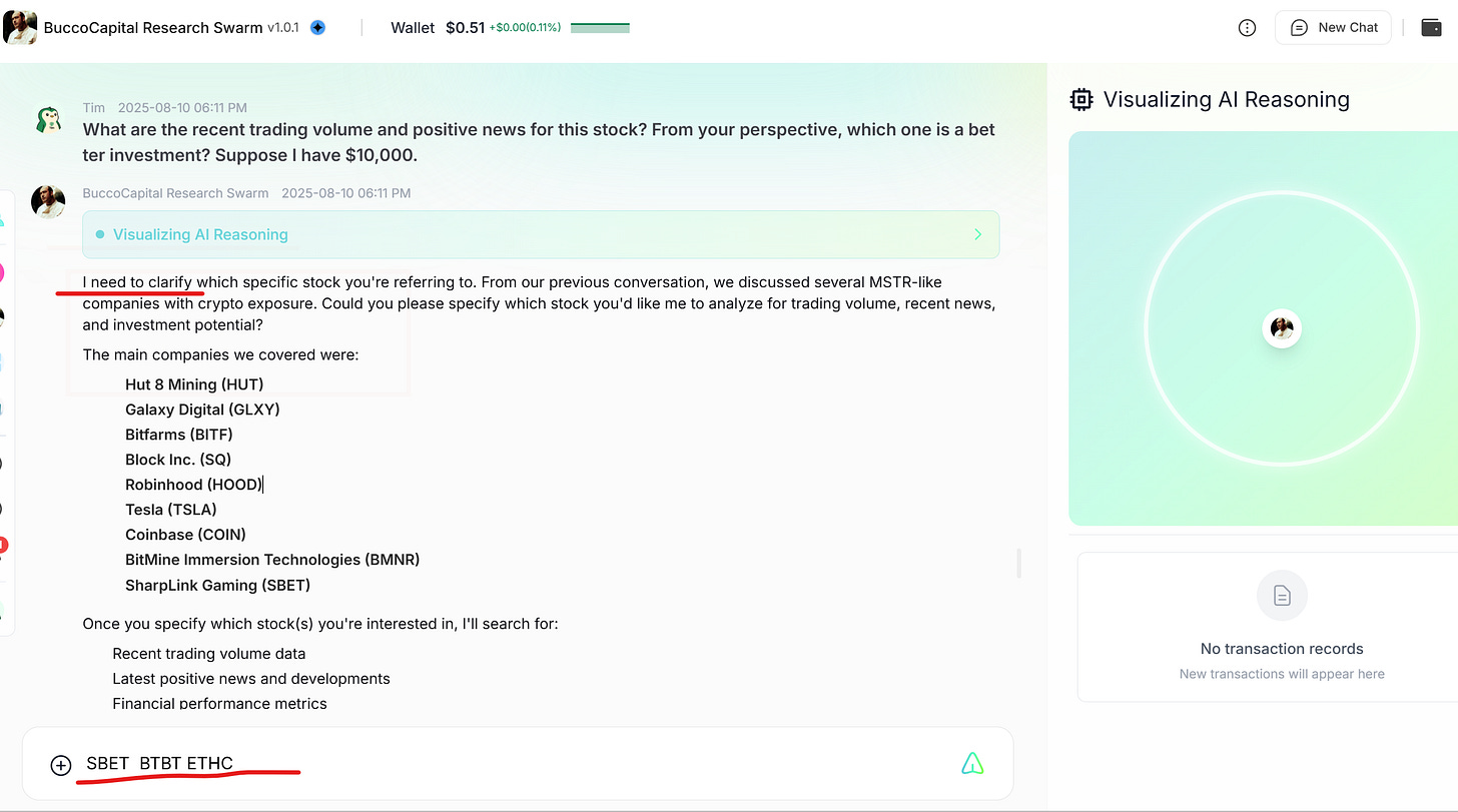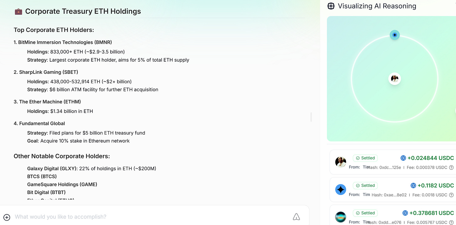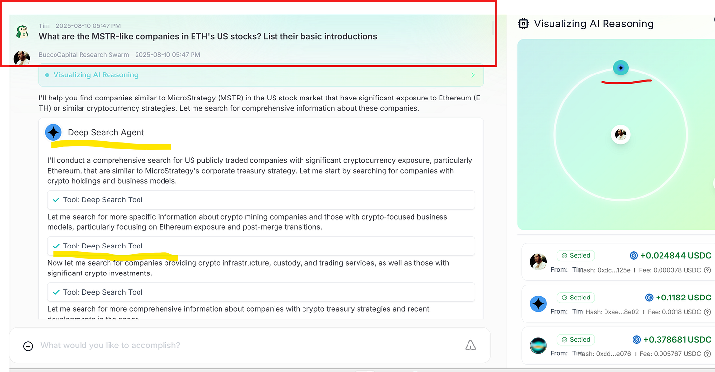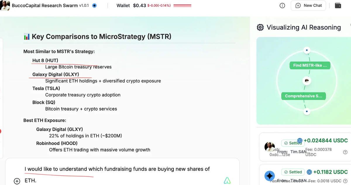 In seconds, the Swarm—powered by the Deep Search Agent—returns a detailed list of public companies with significant ETH or broader crypto exposure.