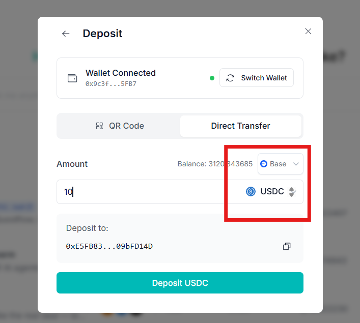 You can deposit USDC via QR code or direct transfer. Ensure you're depositing USDC on Base chain (Layer 2).
