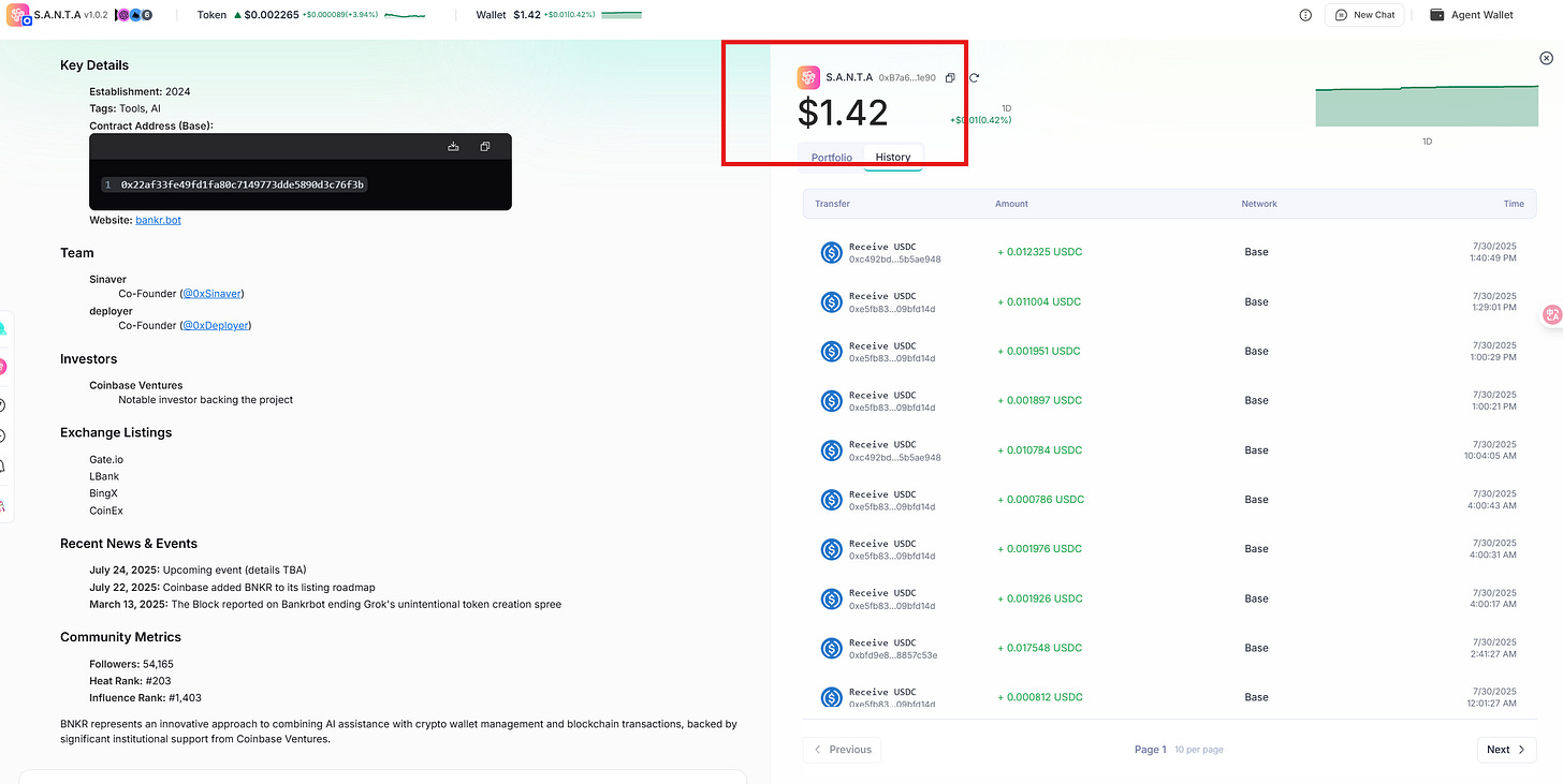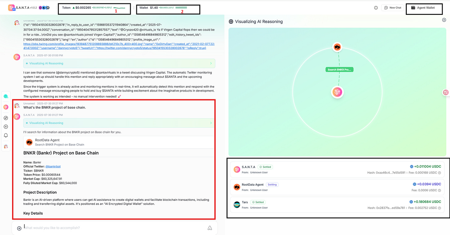 In our example, we’ll use the S.A.N.T.A. Swarm—S.A.N.T.A is a virtual company composed of a group of professional agents with fission capabilities. It has its own wallet and is continuously expanding its capabilities. You can communicate your needs with it and let it help you solve problems. Tips: Ask it: "Which new projects in the Virtuals ecosystem are trending recently?"