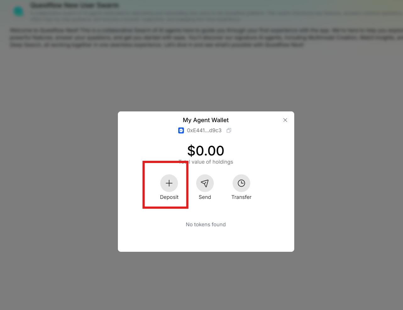 After login, click on Agent Wallet to view your onchain Questflow wallet.