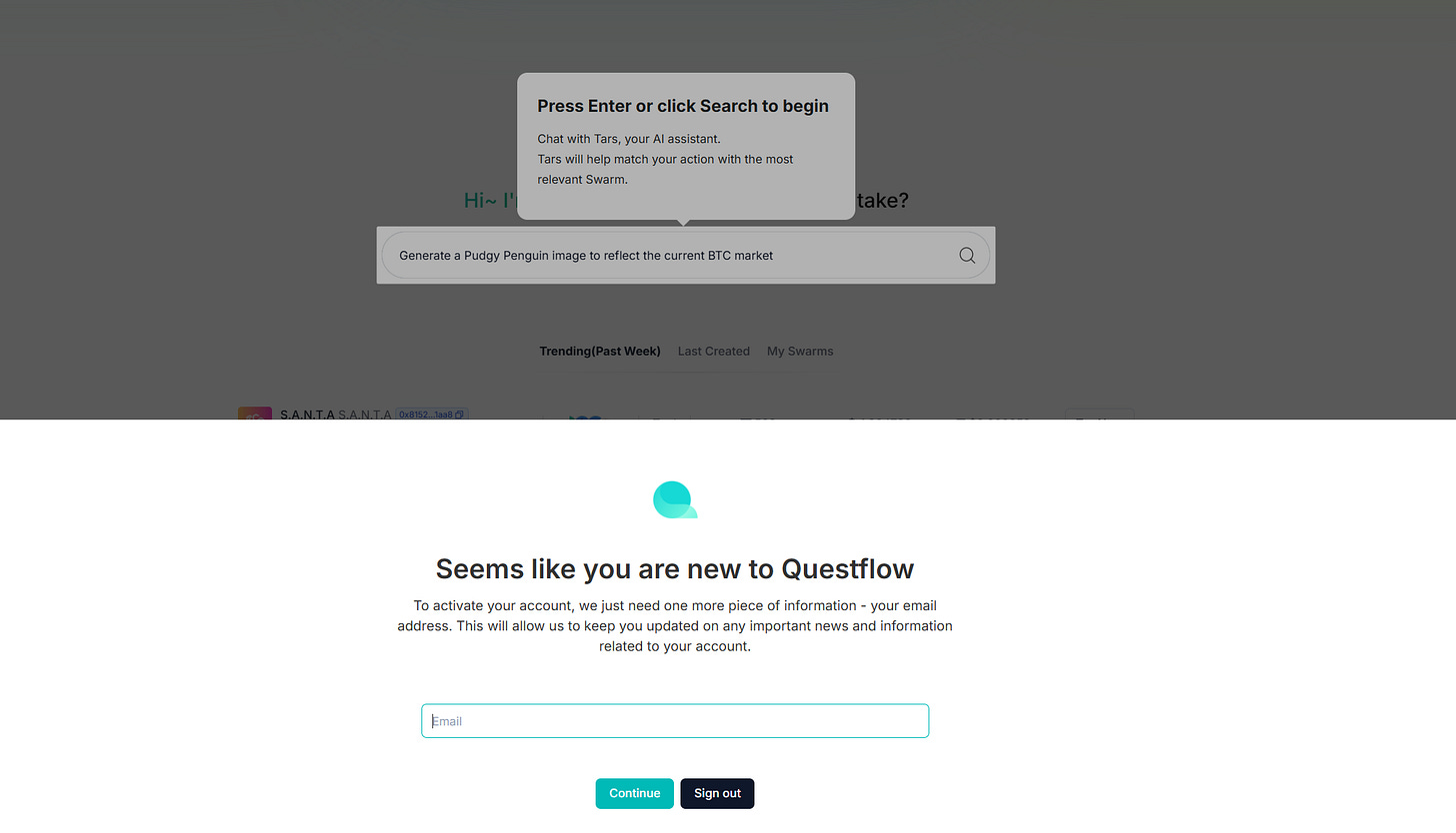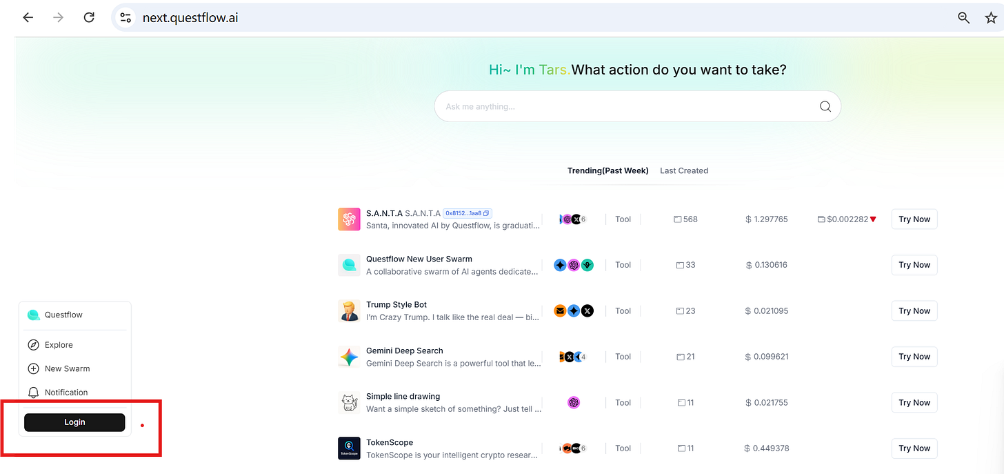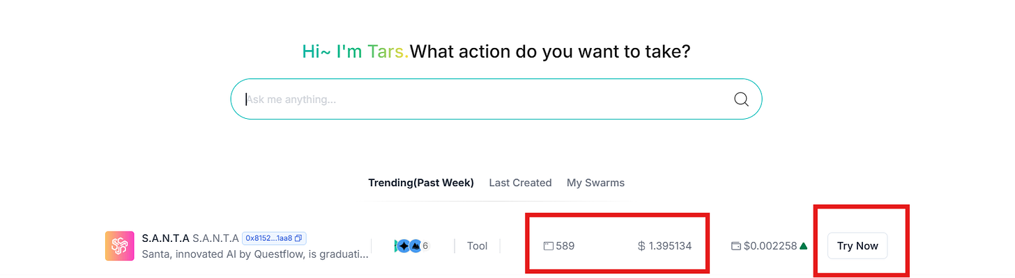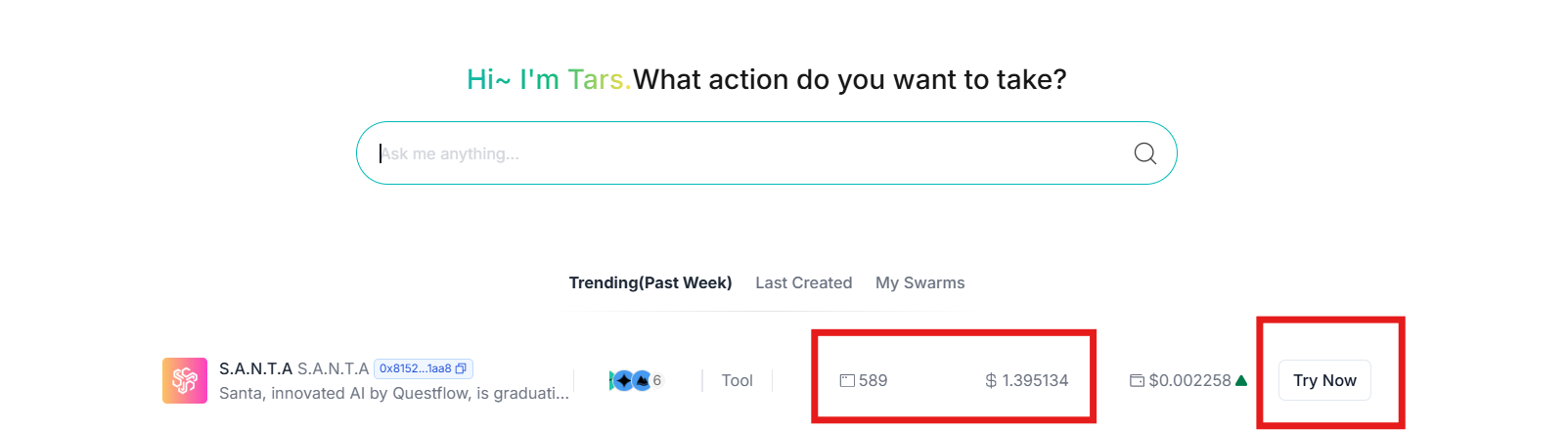 Once you're in, you’ll see a feed of trending Swarms that are executing popular tasks (e.g. SANTA, image generation). Each Swarm lists: