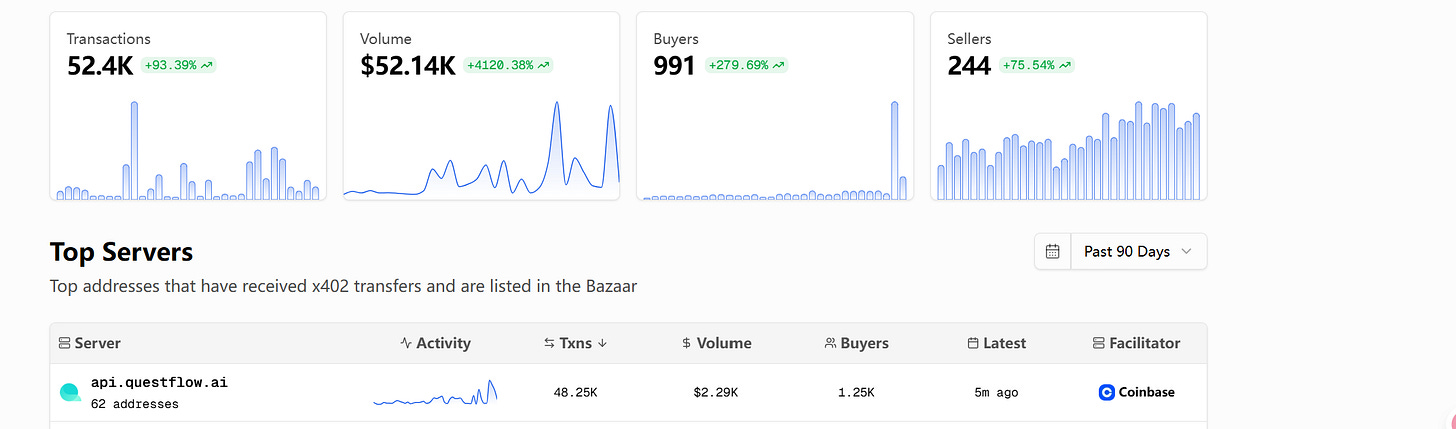 Among the standout projects in the x402 ecosystem, Questflow deserves special attention for its exceptional performance, as evidenced by leading metrics. As the top server in the bazaar, Questflow’s api.questflow.ai has handled 48.25K transactions, generating $2.29K in volume from 1.25K buyers across 62 addresses, with the latest activity just 5 minutes ago through the Coinbase facilitator. Activity trends display strong, consistent peaks, reflecting high engagement and reliability in agentic workflows.
