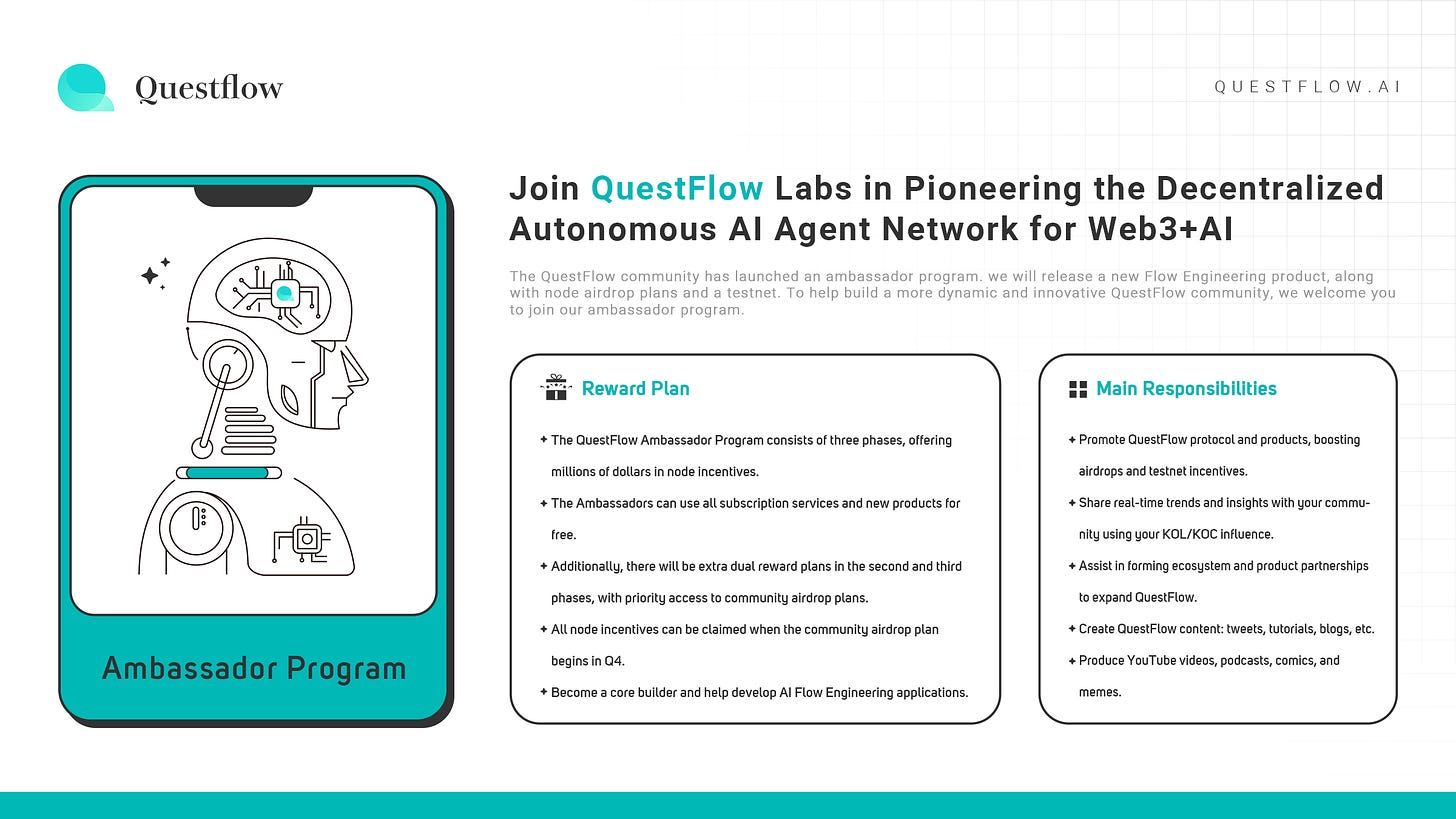 Community Airdrop: Community round airdrop starting in September, distributed in Node form, mainly targeting Questflow Labs product users and community contributors ,which including but not limited to super spreaders, community ambassadors, product subscribers, and users who bring active users to QuestFlow.