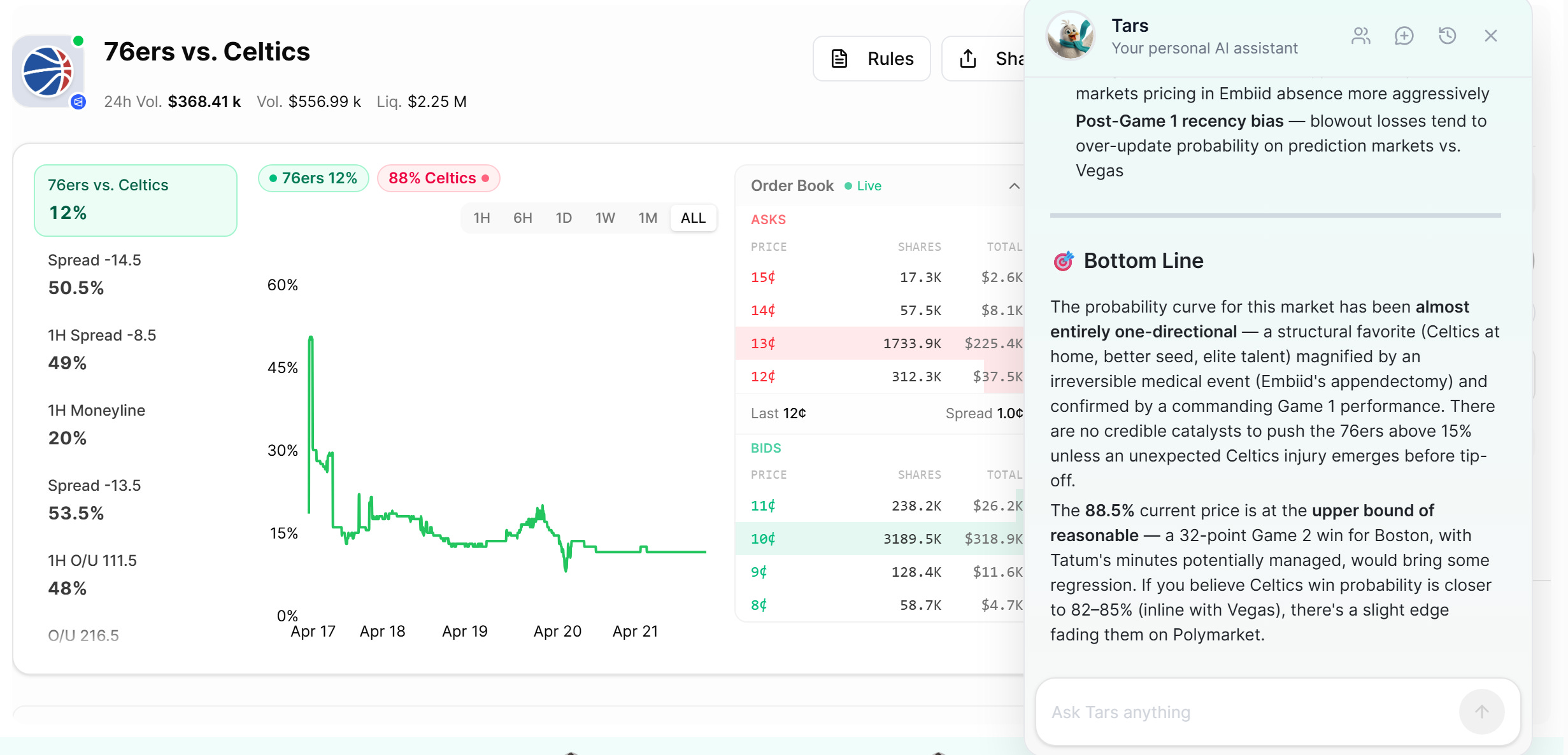 Tars: [analyzing the 76ers vs. Celtics market in real-time]
