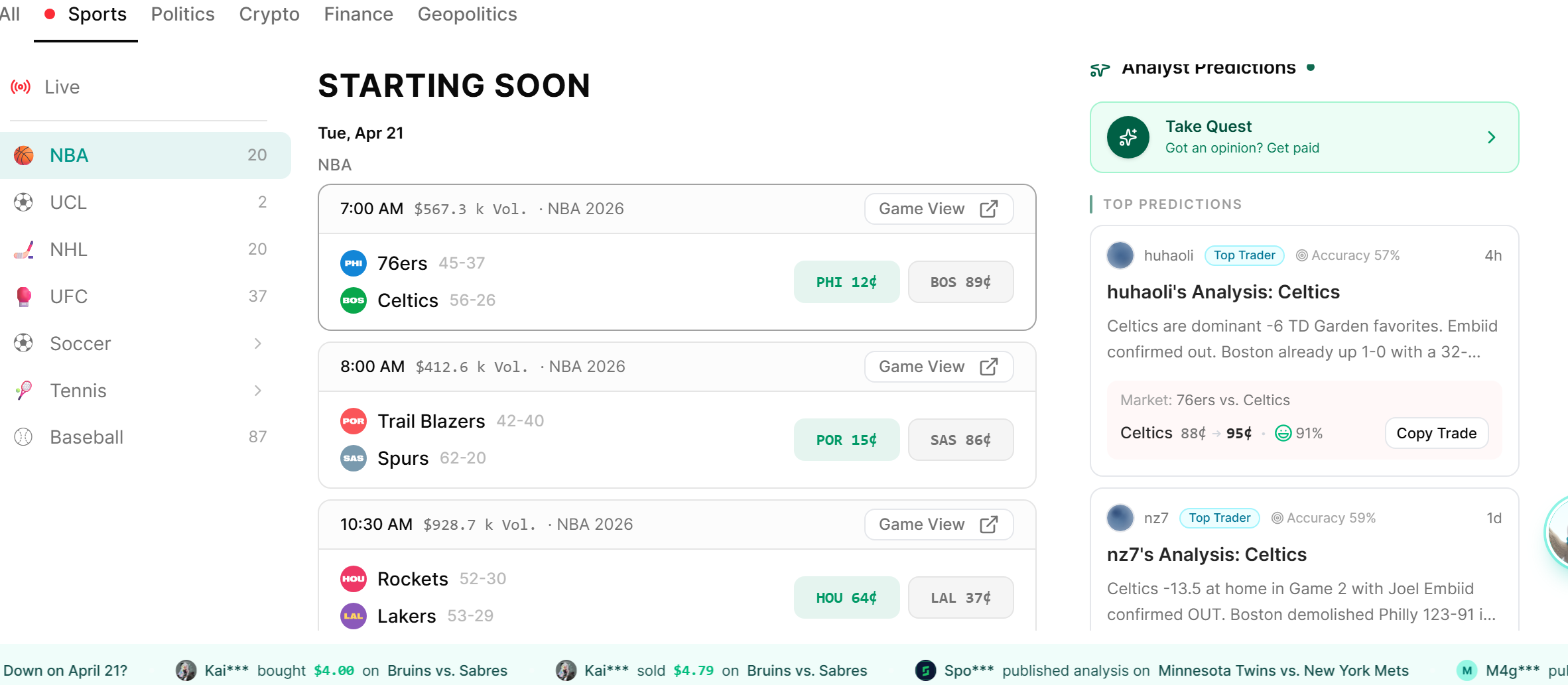 Now look at the left side of the 76ers vs. Celtics page. This is where Questflow’s prediction market infrastructure shows its sophistication.