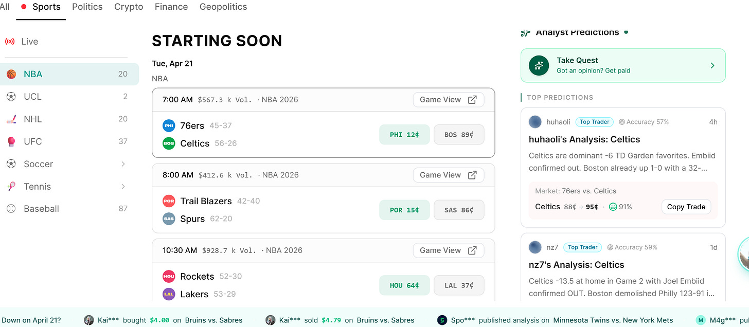 Open any sports prediction platform right now. April 21, 2026. Here’s what you’re facing:
