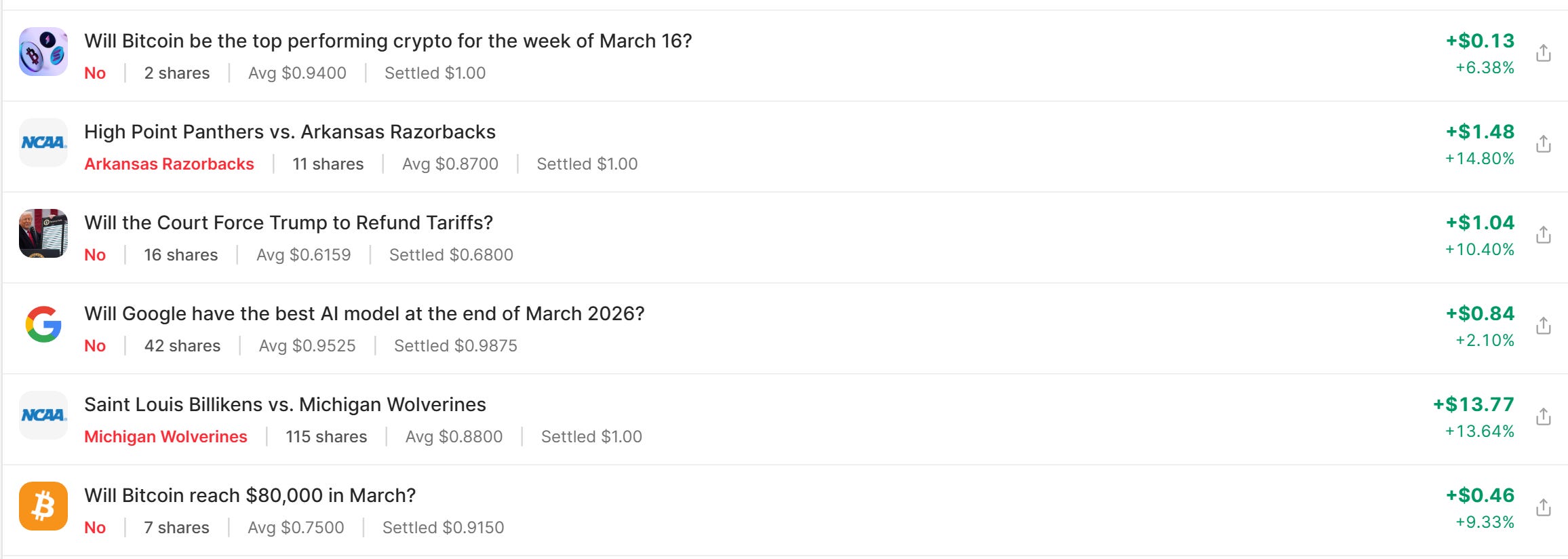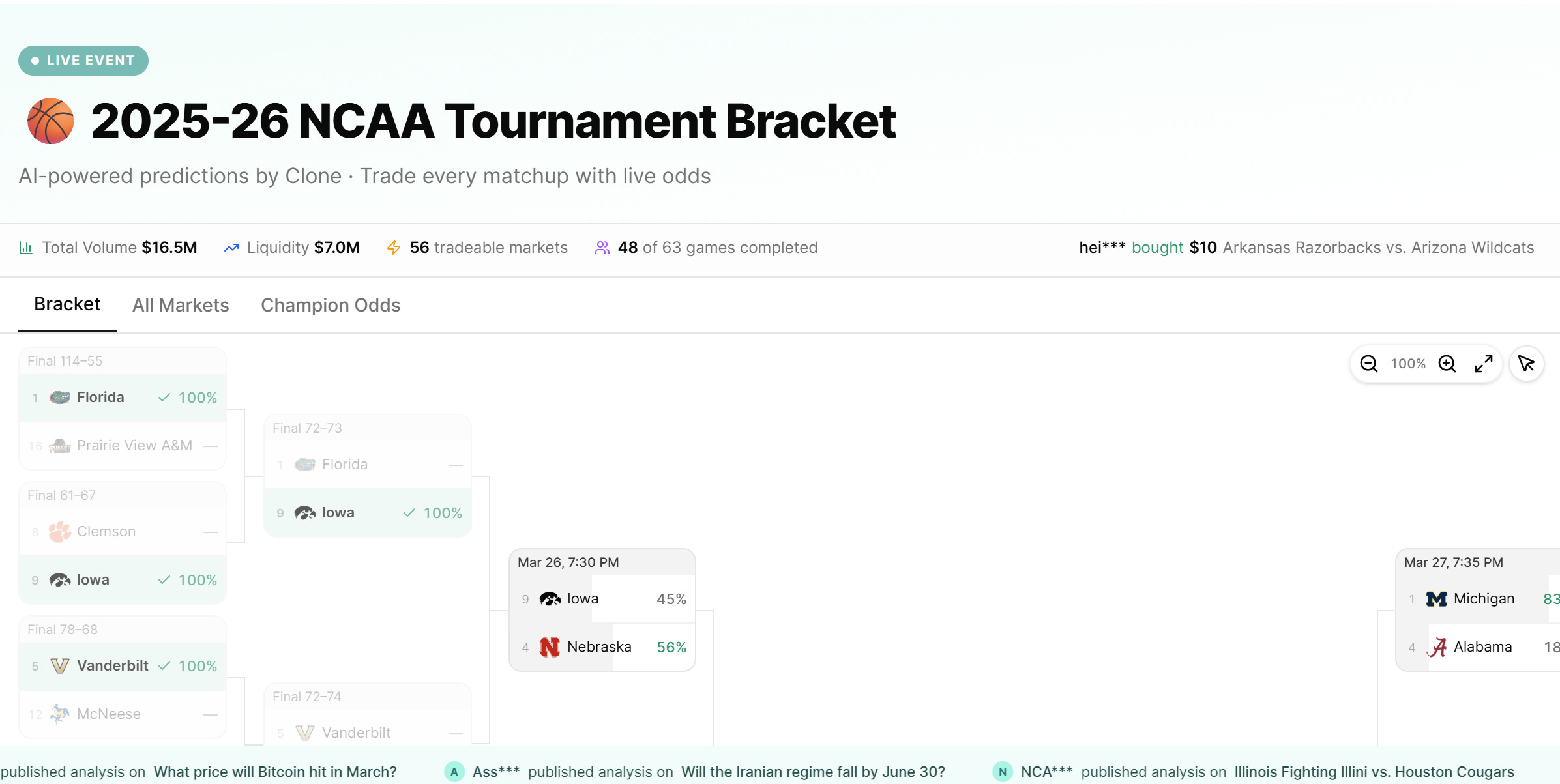 Every game is a market. Scroll through the bracket view and you’ll see: Florida vs. Prairie View A&M (100% settled). Vanderbilt vs. McNeese (100%). But also upcoming matchups with live odds waiting for your analysis. The tournament isn’t one big prediction—it’s 63 separate trading decisions, each offering edge if you can read it correctly.
