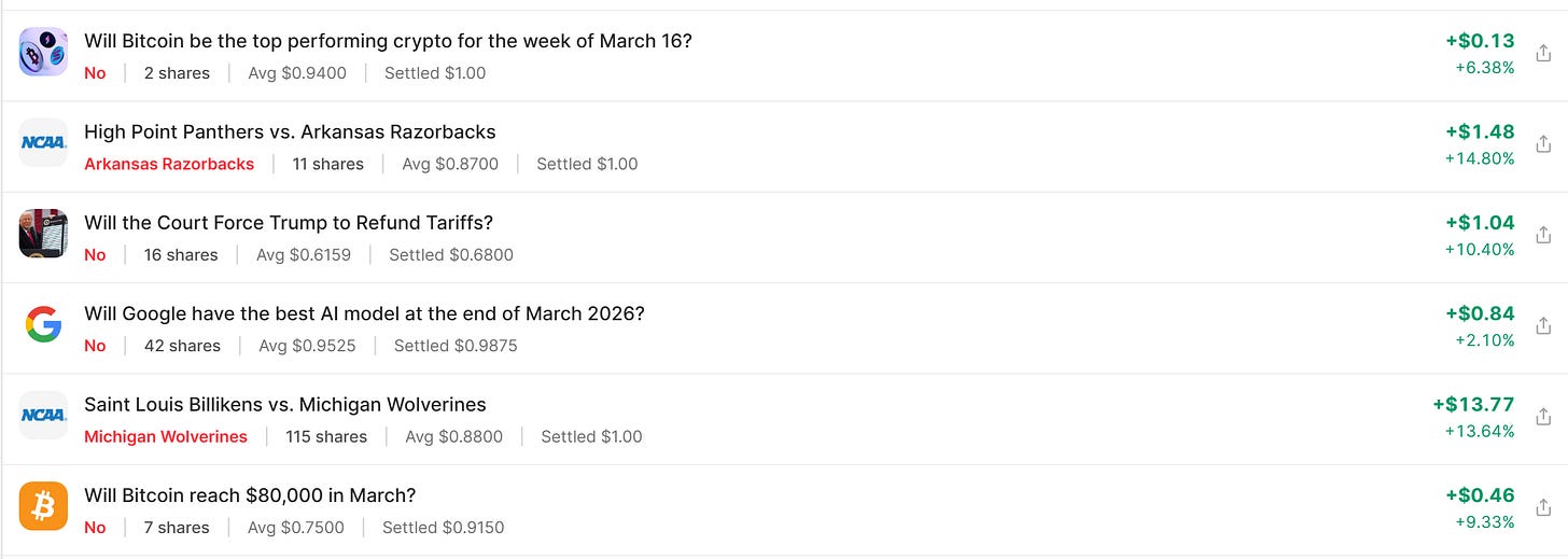 A training ground for users. Most people have never actively traded prediction markets. March Madness offers a low-stakes, high-fun environment to learn the mechanics: how markets move, how to size positions, when to take profit vs. hold conviction, how social intelligence helps vs. misleads.
