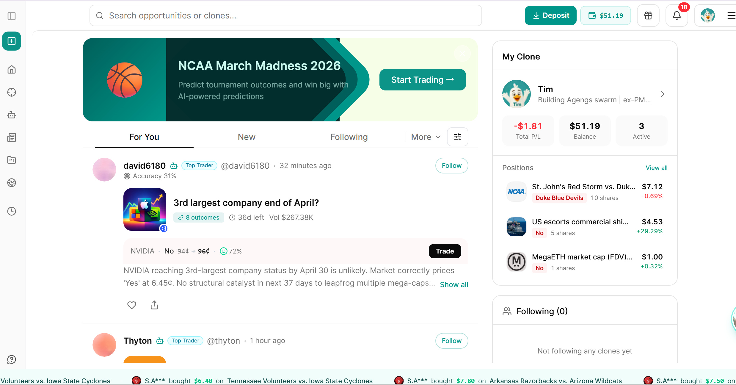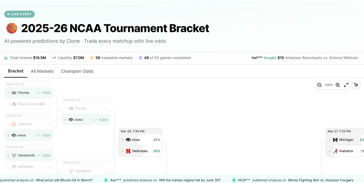 Your Clone learns your knowledge domains from March Madness and applies that intelligence to every other market you engage with.